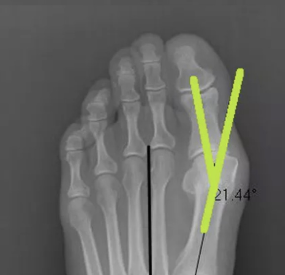 We completed a hands on joint assessment, which included an x-ray. This is Janine's initial x-ray. As you can see below, her x-ray shows that her bunion angle was 21 degrees. The ideal angle is 12-15 degrees.
