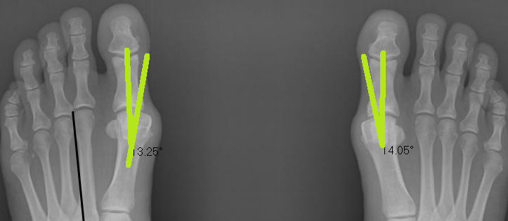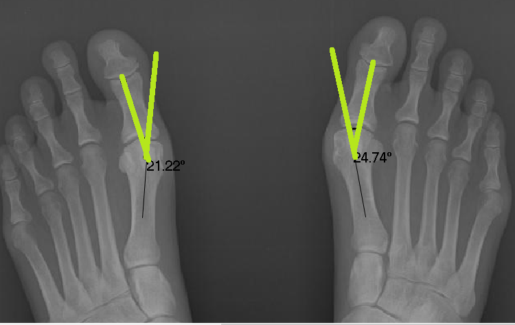 Below is a patient who has completed a short course of Foot Mobilisation Therapy here at Corrective Foot Solutions.Before the treatment the bunion angles are 21.22 and 24.74 degrees. Normal angles are between 12-15 degrees.