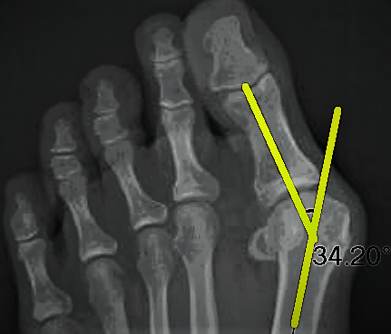 This is Andriany’s initial x-ray, as you can see below her initial bunion angle was 34 degrees which is classified as an advanced bunion, where a normal angle is between 12-15 degrees.