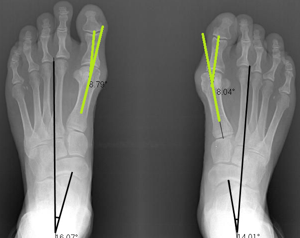 After a short 3 month course of treatment, we followed up with another x-ray. You can clearly see that her bunions have significantly straightened to 9 and 18 degrees.