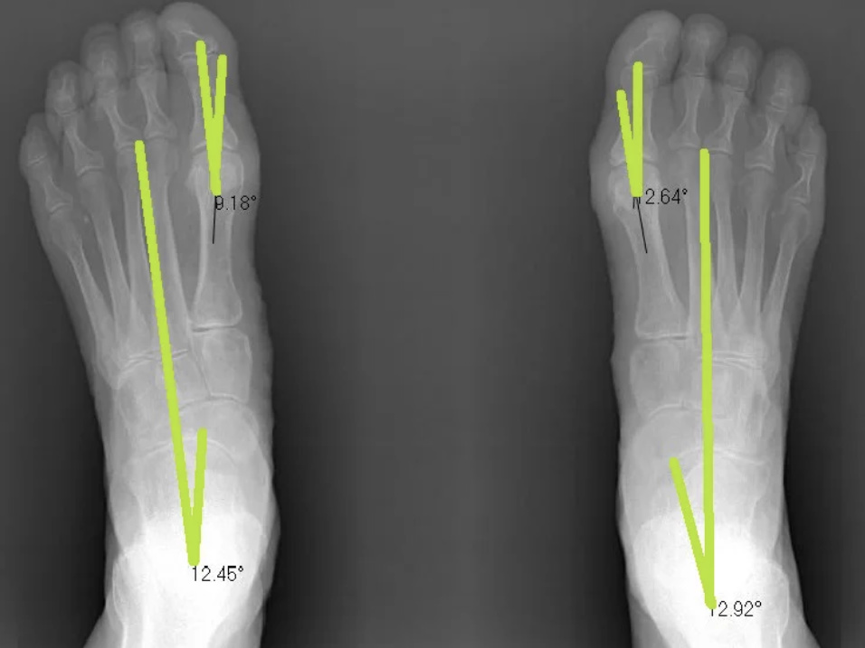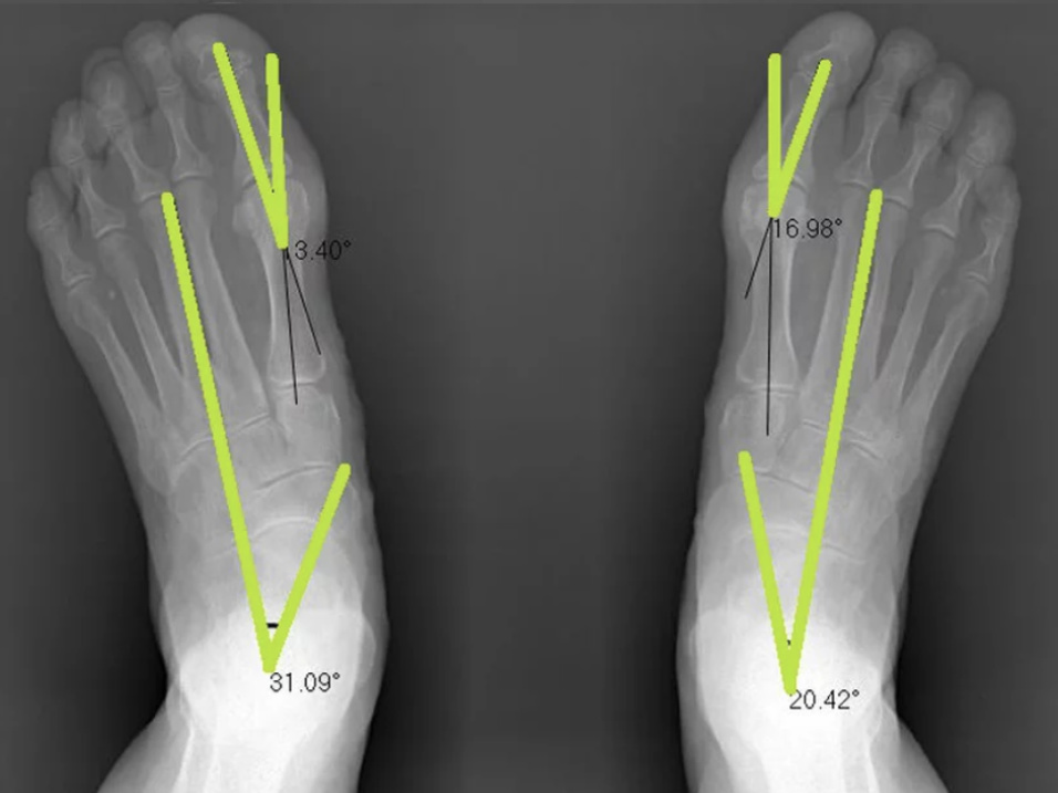 You can clearly see the joint misalignment has improved and she is standing straighter . Her bunion angles have reduced and the bone (talus) in her ankle has repositioned into a normal position which is between 12-18 degrees!